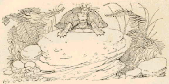 There was Old Moss Back himself (who Billy thought looked uncommonly like a fat old turtle), spread peacefully out on a flat rock, smiling complacently ate everything and everybody, as though he did not know what the cares and worries of a Kingdom were. His attendants, who wore very tight-fitting green livery, hopped about waiting on the ladies and doing all the many little things necessary to maintain a properly conducted court.