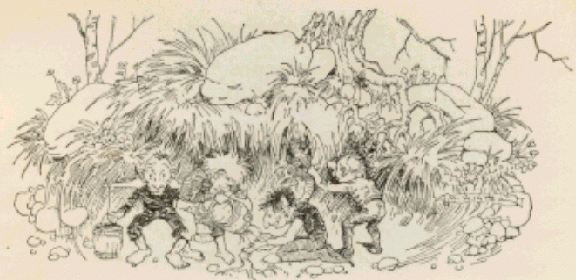 Billy became so interested that he made a great effort to reach the bank; he finally succeeded in doing this by climbing along a stray root Instead of being frightened, as Billy thought they might be, the Gnomes never seemed to notice him at all, but just kept right on with their toil. Not a sound did they make. No one asked any questions, so of course no one made any answers. Each seemed to know exactly what to do, so no one needed to talk.