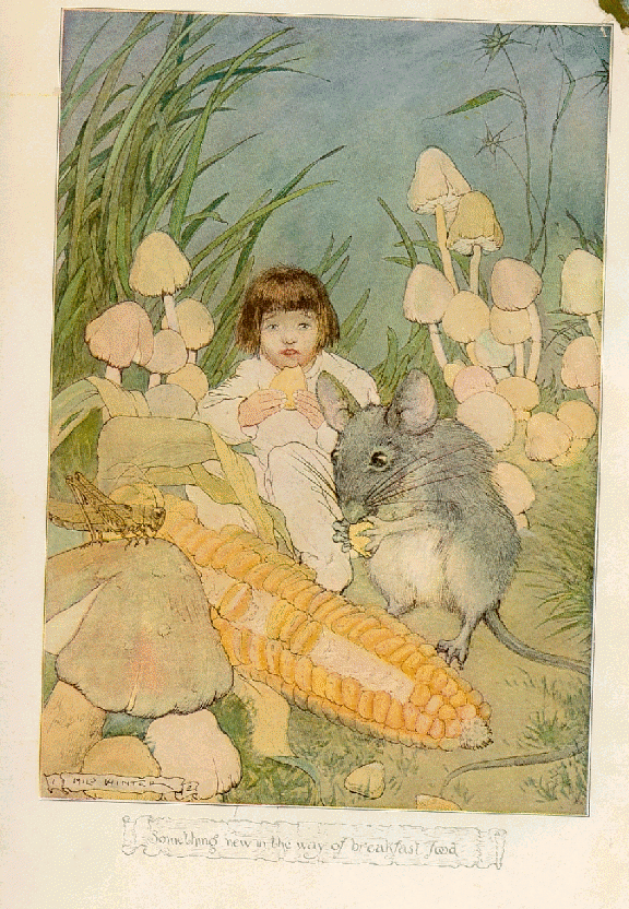Tie followed the Mouse down out of the house, and at a short distance there lay a great ear of corn that looked as big as a log to Billy. The Mouse broke off a kernel, handed it to Billy, and took another for himself. Here was something new in the way of breakfast food; a raw kernel of corn as big as your hand. But it was not bad at all. A trifle tough perhaps, but such things do not count if you are hungry, and your host is as pleasant as the Field Mouse was. He squeaked about the fine weather, and he squeaked about the excellent crops in the field near by. Billy knew now for the first time why a Field Mouse had such large ears. It surely could be for no other reason than that he ate so many ears of corn.