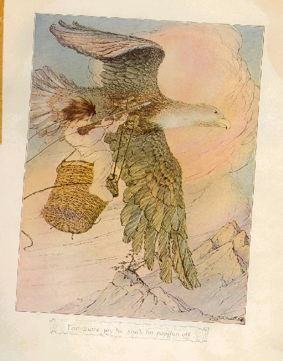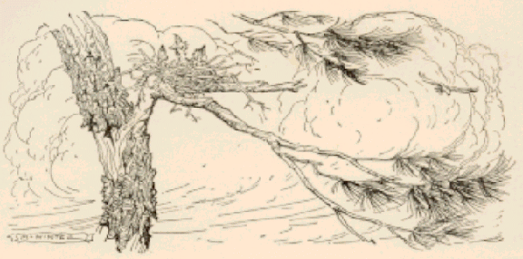 In a short time they came to a low range of hills that rapidly developed into high cliffs and crags. On a very high cliff stood a great pine tree and in the top of it was Baldy’s nest They alighted on a branch, and Billy climbed out of the basket, leaving the pearl in the bottom of it, and ran along until he could peek over into the nest. Of all the scrawny, awkward—looking things Billy had ever seen, these baby Eagles were the scrawniest and awkwardest! Of course he knew that all baby Eagles must be like these, because the old bird was so proud of them. So he spoke of the babies as being very remarkable children.