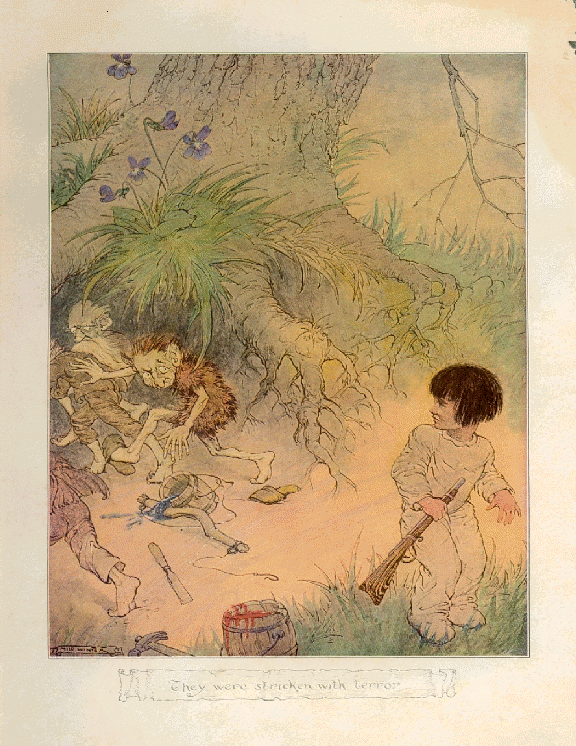 Just as Billy was leaving the entrance of the hole that came out under a great tree, a group of Gnomes carrying paint-pots saw him, in the full light of day. They were stricken with terror, and dropping everything, fled back into the darkness. Why had they not been afraid before, and why should they run now? Then the mysterious actions of the Dwarfs became quite clear to Billy. They could not see him in their own fairy light; but in the strong light of day he
