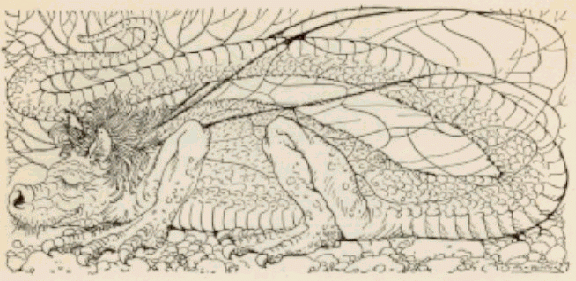 All at once he came to an open place with huge rocks in it, and right in the middle lay an enormous Dragon.