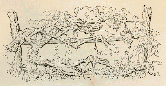 The yard had many wonderful things in it, too. The grape-arbor with its cool green leaves and long twisty vines and roots was an ideal place to play Dragon in. If you stretched your imagination just a little bit you could see fierce and fiery Dragons in the scaly gnarled roots of the vines.