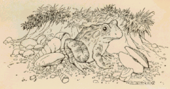 Presently Billy heard a sing-song din that sounded like a chorus of high-pitched kettle-drums, all tuned differently. It was the croaking of the Marsh Frogs. When the noise softened and mellowed a bit, as it did now and then, he could hear the accompanying fiddles of the Katy-Dids and Crickets. This was the Marsh where the big meeting was to be held. The noise was the “marshall” music, meant to call all the Marsh people together.